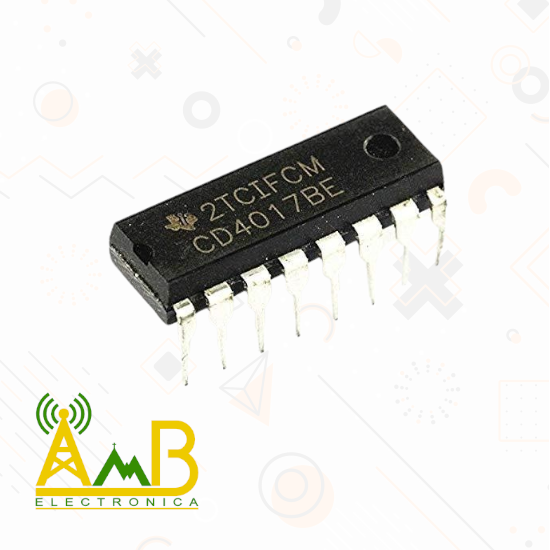 El CD4017 es un contador Johnson CMOS de 10 etapas con decodificación de salida. Cada pulso de reloj activa secuencialmente una de las diez salidas, proporcionando una señal única en cada etapa. Incluye entradas de clock, reset y enable, además de una salida de carry para conexión en cascada con otros contadores.